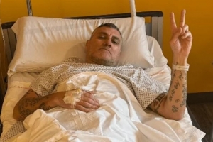 图中他穿着病号服,面带微笑,对着镜头比出胜利的"V"字手势。维耶里在照片下写道:这一关也闯过去了。