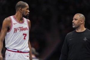 火箭球迷:同意,但这全是乌度卡的问题。在他手下完全没有控卫战术或进攻计划。37 岁的杜兰特每场打得像要上 45 分钟似的,还被强行按在半个控卫的位置上,明明我们有年轻后卫或者更能跑的小伙子可以运球过半场。杜兰特这样折腾还能得这么多分简直是奇迹。