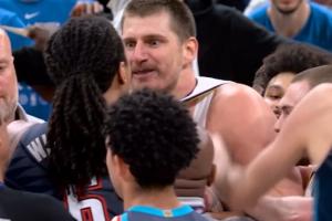在比赛第四节,多特将约基奇撞翻在地,约基奇非常不满,杰林威上来与约基奇纠缠,爆发肢体冲突。