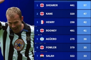 英超历史单场至少2球次数榜:希勒57次居首,哈兰德125场27次第九